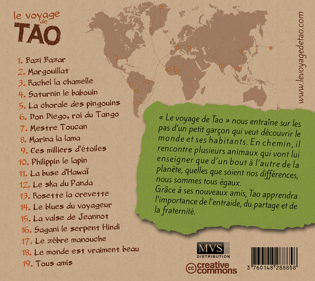 Le voyage de Tao nous entraîne sur les pas d’un petit garçon qui veut découvrir le monde et ses habitants. En chemin, il rencontre plusieurs animaux qui vont lui enseigner que d’un bout à l’autre de la planète, quelles que soient nos différences, nous sommes tous égaux. Tao apprendra l'importance de l'entraide, du partage et de la fraternité. Jouant avec beaucoup d’humour et de talents avec les styles musicaux (salsa, blues, valse, tango, ska...), ce sympathique album tombera avec bonheur dans les oreilles des tout-petits (dès 3 ans), toujours avides de ces jolies chansons que l’on retient en deux temps trois mouvements, et ravira les plus grands.