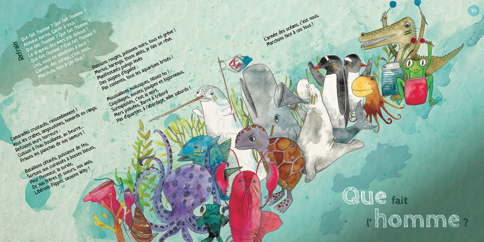 C’est la voix de l’océan qui nous partage sa détresse. Nous tendons l’oreille un peu plus encore : une tortue nostalgique, une baleine déterminée, un crabe bon vivant... Des animaux marins, parfois en colère, qui se lèvent et nous chantent leur impuissance face à la pollution de l’étendue bleue.